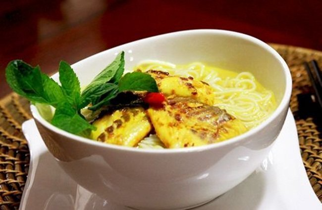 | 3.Bún cá | Thịt cá dai, có khi được xào chung với nghệ trước, nước dùng được thêm thắt mắm miền tây, hầm từ xương gà, rau muống bào, có khi là giá, bông điên điển, hay bắp chuối bào giúp tô bún càng thêm nhiều màu sắc. Mở nồi nước dùng như mở một thế giới ẩm thực mới lạ. Một tô bún cá có giá rất mềm, nhưng lại đầy đủ chất dinh dưỡng. Khi bạn đến với An Giang trong mùa mưa, bạn sẽ được thưởng thức món ăn này một cách trọn vẹn nhất, không chỉ vì thịt cá, mà còn là mùa điên điển vàng nở rộ trên sông. | ![]() |